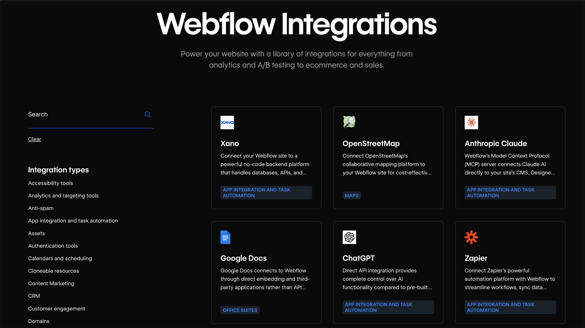Before building anything, it's worth seeing what already exists. The Webflow Integrations page brings together Marketplace Apps, automation options, and supported connections in one place. It iis a good first stop when you're scoping an integration need.